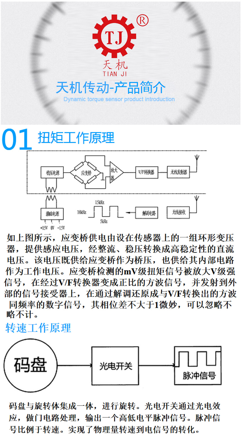 天機(jī)傳動生產(chǎn)銷售的扭矩傳感器又稱動態(tài)扭矩傳感器或非接觸扭矩傳感器,是采用應(yīng)變片電測技術(shù) ,在彈性軸上組成應(yīng)變橋,向應(yīng)變橋提供電源即可測得該彈性軸受扭的電信號。將該應(yīng)變信號放大后,經(jīng)過壓/頻轉(zhuǎn)換,變成與扭應(yīng)變成正比的頻率信號。該傳感器可以精確測量各種扭力、轉(zhuǎn)速及機(jī)械功率。扭矩傳感器,動態(tài)扭矩傳感器,非接觸扭矩傳感器特點(diǎn):